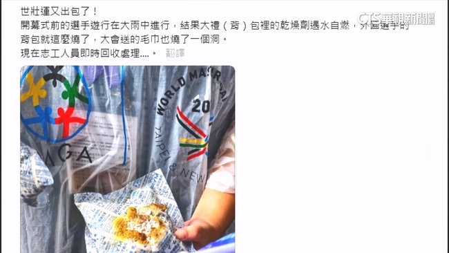 2025雙北世壯運的開幕典禮,昨(17)日晚上登場,開幕遊行則在下午5點多,從台北市政府出發遊行,雖然天候不佳,下起大雨,來自各國的選手還是穿上雨衣熱情參與。但有參賽者目擊,主辦單位贈送的「大禮包」裡頭的乾燥劑遇水自燃,外國選手的背包以及大會贈送的毛巾,都被燒破一個洞,幸好沒有人因此受傷。乾燥劑之所以會自燃,就是因為裡頭含有生石灰,遇水會發生放熱反應產生大量的熱能,一定要多加留意。