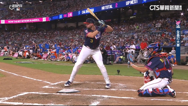 華視賽事主播陳亞理VS.球評耿伯軒說:「其實剩下最後一個出局數,他應該站到右打區來試試看,不過現在這個已經到最後一輪了,不是開玩笑的時候了,有,又有了,還有喔,18支喔。」西雅圖水手捕手Cal Raleigh,不僅成功登上大聯盟明星賽全壘打大賽舞台,還闖進最一輪,先攻的他累積18轟,在對手Junior Caminero停在15轟之後,他也確定成為8歲的自己口中的全壘打大賽冠軍!