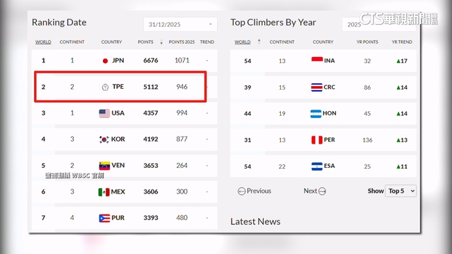 世界棒壘球總會在當地時間12月31日,公布了「男子棒球」最新的世界排名,日本以6676分,成為2025年年終第一名;至於奪下世界12強棒球賽冠軍的Team Taiwan,則是以5112分,排在第2。