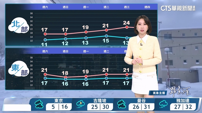 明(21)日清晨輻射冷卻影響,西半部低溫約12至16度,東半部約15至17度,其中在苗栗、臺中、彰化、南投及花蓮局部地區有10度左右的低溫,天氣寒冷請做好保暖工作,白天高溫北臺灣約16至17度,其他地區約21至26度,下午開始大陸冷氣團南下,北臺灣天氣將逐漸轉冷,其他地區入夜後溫度近一步下降;外島氣溫方面,澎湖16至19度、金門12至18度、馬祖10至13度;天氣方面,迎風面的桃園以北、宜花地區及北部山區整天雲量較多,偶有局部降雨,其他地區及澎、金、馬為多雲到晴。