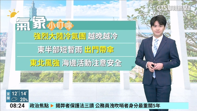 今(28)日強烈大陸冷氣團影響,各地天氣寒冷,清晨中部以北及東北部氣溫約13、14度,新北市有出現局部10度以下低溫,南部及花東15到17度,白天北臺灣持續寒冷,高溫只有13、14度,其他地區則回升至17到21度,入夜後是這波冷氣團最冷的時候,配合輻射冷卻作用,臺南以北及宜蘭將出現10到11度的低溫,其中苗栗以北及宜蘭有局部10度以下低溫發生的機率,高屏及花東也只有12、13度,請做好保暖的工作。