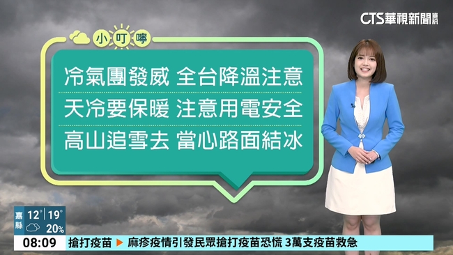 今(10)日強烈大陸冷氣團影響,各地早晚寒冷,西半部及東北部低溫約11至13度,其中嘉義以北及宜蘭有局部10度以下低溫發生的機率,花東則在15度左右,白天北臺灣持續寒冷,高溫只有12至14度,新竹以北及宜蘭局部地區仍有持續10度左右或以下氣溫發生的機率,低溫出現時間長,請做好保暖的工作。