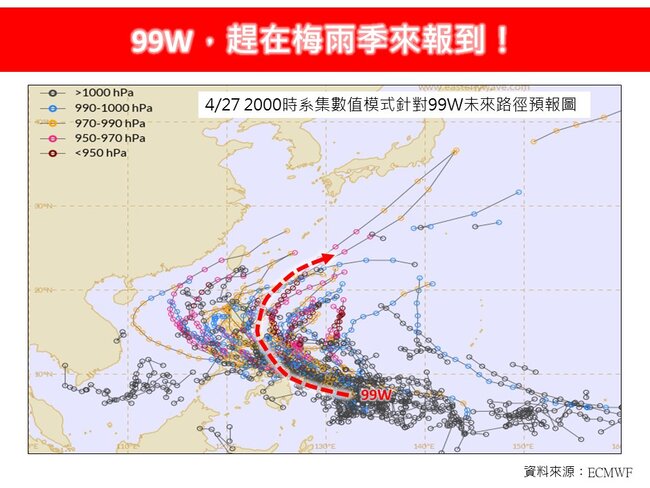 根據模式結果顯示,林得恩指出,99W在5月1日(週四)前後,強度就會繼續增強,後續將循環境駛流場導引,以拋物線方式遠離,並接近日本南方海域。