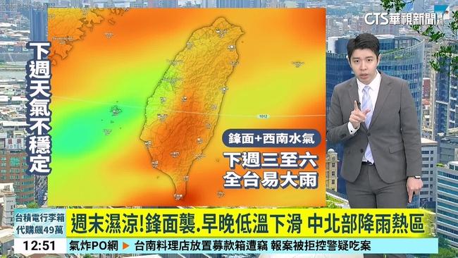今(23)日各地大多為晴到多雲,花東及恆春半島不定時有零星短暫陣雨,午後大臺北、南投、嘉義以南、東北部、東部地區及其他山區有局部短暫雷陣雨,山區並有局部大雨發生的機率,外出建議攜帶雨具備用,並且留意氣象署發布的相關即時訊息;氣溫方面,高溫炎熱,各地高溫約31到36度,大臺北、花東地區及中南部近山區易出現局部36度以上高溫,尤其臺東有焚風發生的機率,南部近山區及臺東甚至有局部38度左右或以上極端高溫發生的機率,外出請注意防曬並多補充水分。