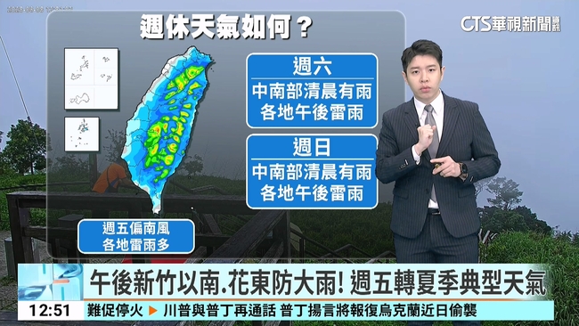 今(5)日滯留鋒面南移至巴士海峽,鋒面結構雖較為鬆散,但臺灣附近水氣仍多,大氣環境不穩定,新竹以南地區及花蓮、臺東山區有不定時的短暫陣雨或雷雨,並且易有短延時強降雨及局部大雨發生的機率,其他地區也有短暫陣雨,建議外出攜帶雨具備用;氣溫方面,由於東北季風減弱,臺灣附近漸轉偏東風,氣溫略回升,預測東半部高溫約27、28度,西半部地區約29至32度,南部近山區溫度會再高一些,感受微熱,至於各地低溫約23至25度。離島天氣:澎、金、馬均為短暫陣雨的天氣,澎湖25至28度,金門23至28度,馬祖22至25度。