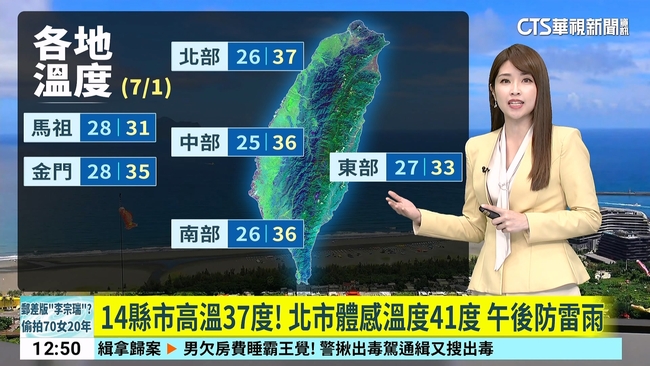 關心7月1日的天氣!各地溫度還是晴朗炎熱,北部地區高溫37度,中南部高溫36度,不過體感溫度,都還會再高個3到4度,提醒大家,要防曬補水,不要中暑了!紫外線今天幾乎全台都是危險級,曝曬15分鐘之內,就有可能會曬傷了,所以要塗抹防曬油,穿輕薄的長袖衣物,也盡量不要在烈日下活動。今(1)日中午過後,嘉義以南有局部短暫雷陣雨,新竹到雲林一帶和其他山區也可能也會下午後雷陣雨。明(2)日下午,新竹以南和各地山區同樣有機會出現雷陣雨。