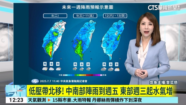 今(7)日第4號颱風及其外圍環流影響,西半部地區及馬祖有短暫陣雨或雷雨,南部地區、中部山區及馬祖仍有局部大雨發生的機率,其他地區及澎湖、金門為短暫陣雨後多雲,隨著颱風逐漸北上遠離,各地雨勢將逐漸減緩;氣溫方面,各地高溫普遍為31、32度,在花東及金門局部地區受到沉降作用影響高溫可以來到33至36度,臺東則有焚風發生的機率。