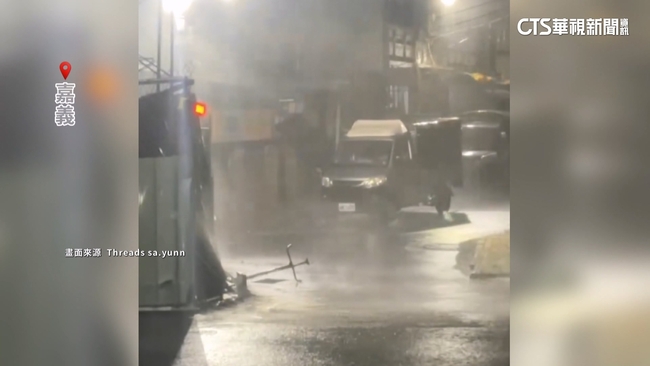 狂風挾帶大雨,有民眾拍到宛如地獄的畫面,當時路上的車子都停了下來,這風雨大到,沒有人敢再繼續往前開,強風的威力真的驚人,嘉義市區也有民眾拍到,一輛小貨車被風吹到往後退,直到撞到後面的車才停下來,而這段監視器畫面,則可以看到,原本還有車輛經過的馬路,下一秒樹木和巨大招牌,直接掉落,所幸無人受傷。
