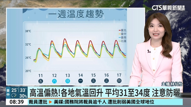 特別在桃園以北地區及東北部山區有局部大雨發生的機率,午後戶外活動仍需注意天氣的變化;氣溫方面,各地高溫回升,普遍來到31至34度,低溫為24至26度,體感高溫偏熱。