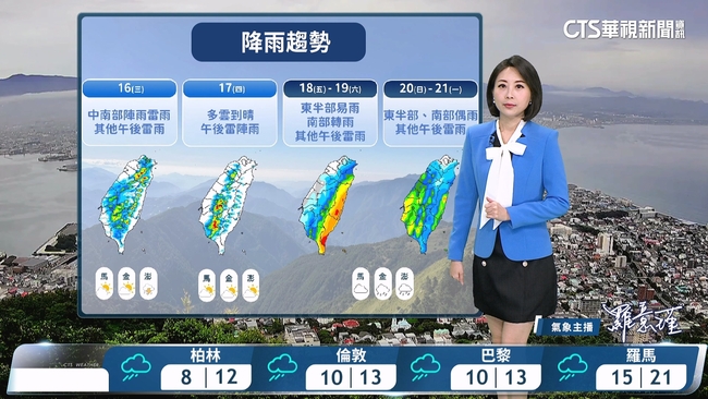 明(16)日環境持續吹西南風,苗栗以南地區不定時有短暫陣雨或雷雨,主要在清晨至上午降雨較明顯,且有局部較大雨勢發生的機率,其他地區則為多雲到晴,午後有局部短暫雷陣雨,尤其大臺北地區及各地山區有局部大雨發生的機率,出門請記得攜帶雨具備用;氣溫方面,中南部雲多下雨,高溫為32、33度,東半部為33、34度,而北部則可以來到35度左右,尤其大臺北地區局部可能來到36度以上,戶外活動請多補充水分,至於各地低溫約26至28度。