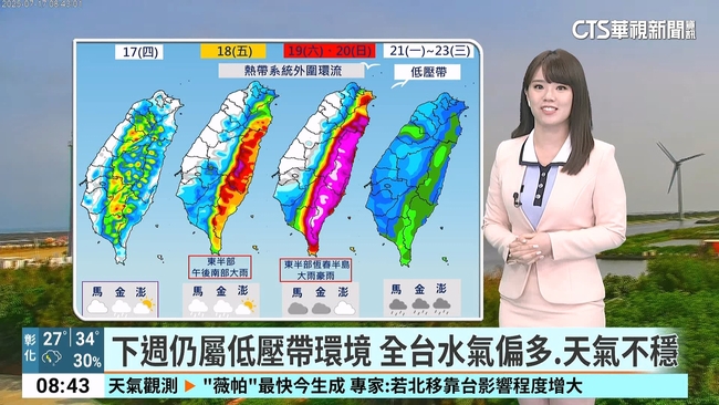 今(17)日環境逐漸由西南風轉為偏東風,清晨至上午中南部地區有零星降雨機率,不過降雨範圍較小、也較短暫,而其他地區為多雲到晴,午後要留意局部短暫雷陣雨,尤其各地山區及南部地區對流發展旺盛,有局部大雨發生的機率,外出請記得攜帶雨具備用,晚上隨著風向轉變,東半部地區也逐漸有零星短暫陣雨出現;氣溫方面,各地高溫普遍為32至35度,尤其大臺北及彰化有局部36度以上高溫發生的機率,近中午前後紫外線偏強,戶外活動請注意做好防曬並多補充水分,至於各地低溫約25至28度。