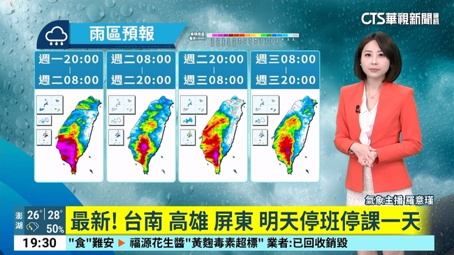 今晚至明(29)日西南氣流及第8號颱風外圍環流影響,各地天氣不穩定,中南部地區降雨更加明顯,易有短延時強降雨,並有大雨或局部豪雨發生機率,尤其南部地區及中部山區有局部豪雨等級以上降雨發生的機率,請特別留意短延時強降雨可能伴隨雷擊及強陣風等劇烈天氣現象,外出活動請注意自身安全,山區活動請留意坍方、落石、土石流及溪水暴漲,低窪地區也需留意積淹水情形;至於北部及東半部地區也有局部短暫陣雨或雷雨,北部地區亦有局部大雨發生的機率;溫度方面,南部及花東高溫為30、31度,中部以北及宜蘭高溫為32、33度,至於各地低溫為25至27度;離島氣溫:澎湖26至30度,金門27至32度,馬祖27至31度。