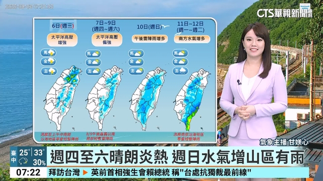今(6)日太平洋高壓逐漸西伸,臺灣附近為南南西至偏南風,水氣持續減少,各地大多為多雲到晴,僅清晨至上午中南部沿海地區有零星短暫陣雨,午後中部以北地區及其他山區有局部短暫雷陣雨;由於連日的降雨,山區請特別留意坍方、落石等現象,前往山區或溪河活動應注意自身安全;氣溫方面,中南部及東北部高溫約33度左右,花東30至31度,北部地區可達35、36度,特別是大臺北有連續出現36度以上高溫的機率,中午前後紫外線偏強,請多注意防曬並多補充水分;離島氣溫:澎湖26至29度、金門26至29度、馬祖27至31度。