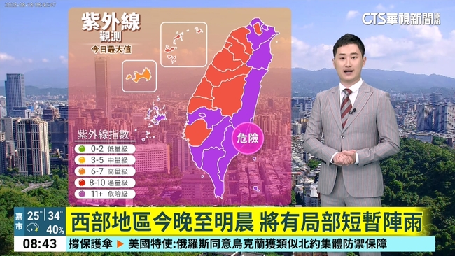 今(18)日南方雲系北移,台東及屏東地區整天不定時有短暫陣雨或雷雨,其他地區為多雲到晴,午後各地有局部短暫雷陣雨,西半部地區及東半部山區有局部大雨,南部地區及中部山區不排除有局部短延時豪雨發生的機率,午後請留意天氣變化及短延時強降雨伴隨的雷擊、強陣風等劇烈天氣現象,外出攜帶雨具備用,前往山區也要留意坍方、落石及溪水暴漲,夜晚至清晨西半部地區亦有局部短暫陣雨;氣溫方面,東半部高溫約31、32度,西半部高溫可以來到34、35度,尤其大台北地區及中南部近山區有局部36度左右或以上高溫發生的機率,中午前後紫外線偏強,外出請注意防曬並多補充水分。離島天氣:澎湖、金門多雲短暫陣雨,氣溫26至31度;馬祖晴到多雲氣溫26至30度。南部沿海及恆春半島有長浪發生的機率,海邊活動請注意安全。