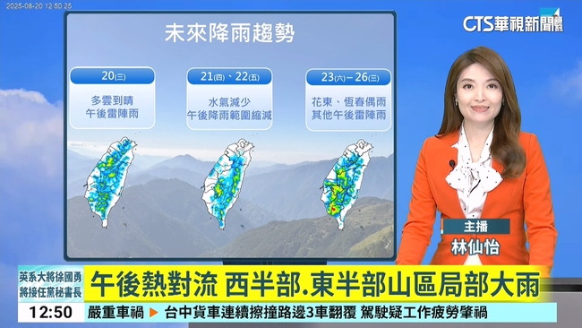 今(20)日水氣稍多,各地為多雲的天氣,午後熱力作用下,各地山區有短暫雷陣雨,其他地區有局部短暫雷陣雨,西半部地區及東半部山區有局部大雨發生的機率,午後仍要留意天氣變化,前往山區亦要留意自身安全,外出請攜帶雨具備用;氣溫方面,東半部高溫約31、32度,西半部高溫可達34、35度,尤臺北市及屏東縣有局部36度左右或以上高溫發生的機率,中午前後紫外線偏強,外出請注意防曬並多補充水分。