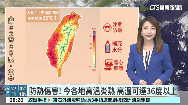今天(13)日各地大多為多雲到晴,臺東、恆春半島偶爾有零星短暫陣雨,清晨西半部地區也有零星短暫陣雨機率,午後在各地山區及西半部近山區平地有局部短暫雷陣雨,其中山區有局部大雨發生,請留意午後天氣變化,外出建議攜帶雨具備用;溫度方面,各地高溫普遍32至35度,其中在大臺北、中南部及臺東地區有局部36度左右或以上高溫發生的機率,中午前後紫外線偏強,戶外活動請注意防曬並多補充水分;澎湖、金門、馬祖均為晴時多雲,氣溫27至32度。