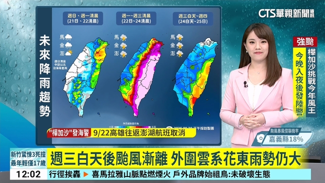 受樺加沙颱風及其外圍環流影響,嘉義以北、基隆北海岸、東半部地區、恆春半島、高屏山區及各離島容易有平均風6級以上或陣風8級以上的強風;明天恆春半島及蘭嶼甚至有平均風9級以上或陣風11級以上發生的機率;今天基隆北海岸、東半部(含蘭嶼、綠島)沿海及恆春半島易有長浪,晚起南部沿海及明晚起澎湖、馬祖也有長浪發生的機率,非必要請避免前往海邊活動。