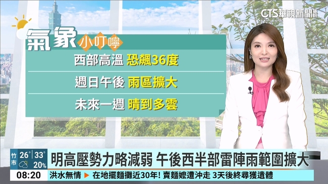 連假台天氣偏向夏季型態。各地大多為多雲到晴,僅基隆北海岸、東半部及恆春半島有零星短暫陣雨,午後南部地區及山區,有局部雷陣雨發生。白天氣溫仍偏高,西半部地區有機會出現36度以上高溫。周日高壓勢力略為減弱,午後西半部雷陣雨範圍及雨量可能擴大,南部平地也有降雨機會。近期天氣依舊受到太平洋高壓主導,環境穩定、氣溫偏高,未來一周整體仍屬晴到多雲型態。