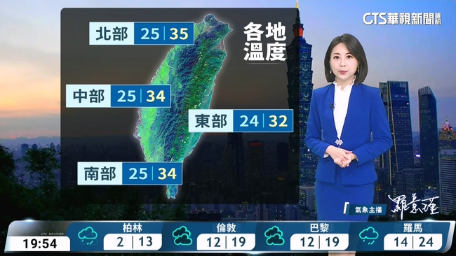 明(1)日太平洋高壓勢力較強,天氣相對穩定,各地大多為晴到多雲,午後南部地區及其他山區有零星短暫雷陣雨;溫度方面,西半部高溫約33至35度,東半部約29至31度,其中大臺北地區有局部36度以上高溫發生的機率,中午前後紫外線偏強,戶外活動請注意防曬並多補充水分,至於各地低溫約24至27度。