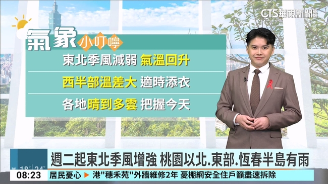 今(29)日東北季風減弱,白天各地氣溫回升,西半部高溫可以來到26至28度,東半部則是24至26度,感受溫暖舒適,不過早晚各地仍偏涼,中部以北及宜蘭低溫為15至17度,尤其竹苗局部地區來到10至12度,而南部及花東為18到20度,日夜溫差大,早出晚歸請適時調整衣物;隨著水氣減少,各地晴朗穩定,僅恆春半島有零星短暫雨。