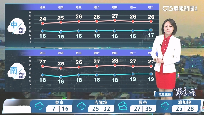 明(3)日東北季風增強,基隆北海岸、大臺北及宜蘭地區易有雨,降雨機率高,並有局部較大雨勢發生的機率,桃園、新竹、東部、東南部地區及恆春半島有局部短暫雨,苗栗及中南部山區亦有零星短暫雨,外出請攜帶雨具備用,中南部地區雲量亦增多;溫度方面,中部以北及東北部、東部明顯轉涼,北臺灣高溫約20、21度,整日感受偏涼,中部及花東高溫約23、24度,南部高溫約24至26度,入夜後各地溫度進一步下降,中部以北低溫約15、16度,南部及花東低溫約18、19度,局部空曠地區及近山區平地溫度會再更低一些,早出晚歸請適時增添衣物以免著涼。