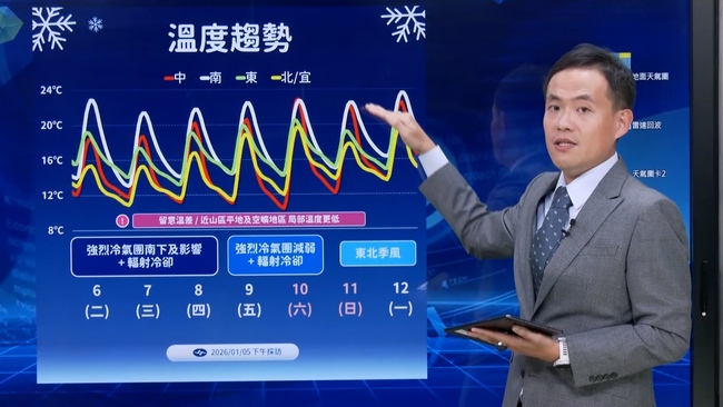 氣象署提醒,受到這波強烈大陸冷氣團及輻射冷卻影響,本週三、四台灣中部以北、宜花地區天氣寒冷,其他地區早晚亦冷,中南部白天有陽光時感受溫暖,日夜溫差大,一直到11日強烈大陸冷氣團稍減弱,氣溫才會稍微回升。氣象署預估週三起中部以北、宜蘭及金、馬低溫約9至13度,南部、花東及澎湖約13至16度。