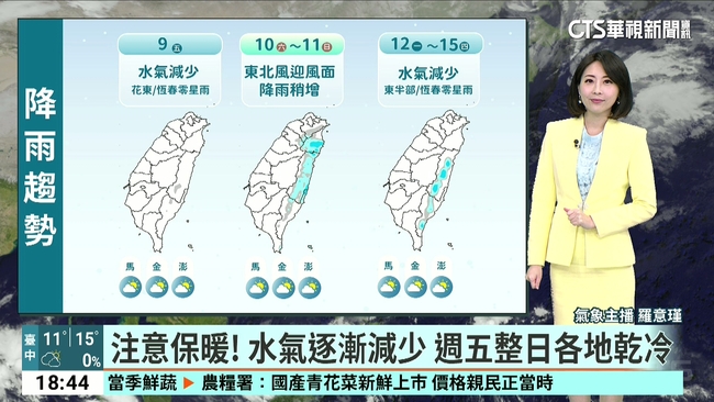 明(9)日強烈大陸冷氣團稍減弱,夜晚及清晨受輻射冷卻影響,溫度仍偏低,西半部及宜蘭低溫約9至13度,花東約14、15度,請注意保暖措施,白天氣溫稍微回升,北部及宜花高溫16至18度,中南部及臺東高溫約20至23度,西半部日夜溫差大,請適時增添衣物;明天各地大多為晴到多雲的天氣,只有在花東地區及恆春半島有零星短暫雨;近期高山氣溫偏低,夜間及清晨路面易結冰並有霧淞、結霜機率,若水氣條件配合,海拔3000公尺以上及中部以北海拔2500公尺左右或以上高山不排除有零星降雪或下冰霰,行車用路及登山請注意路況安全,高海拔山區作物嚴防霜害。