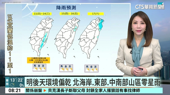今(11)日大陸冷氣團南下及影響,北部及宜蘭整天又會變得比較偏冷,其他地區早晚也冷,西半部及宜蘭低溫普遍約11至13度,其他地區在15度左右,清晨臺南以北、宜蘭及金門仍有局部10度以下低溫發生的機率,請做好保暖工作,高溫方面,北部及宜蘭在15到17度,花東約18、19度,中南部可來到21至23度,中南部日夜溫差仍大;今晨水氣稍多,花東有局部短暫雨,基隆北海岸、宜蘭、恆春半島及西半部山區也有零星短暫雨,其他地區為多雲到晴,白天之後水氣減少,剩下東半部仍有些降雨,其他地區為多雲到晴。