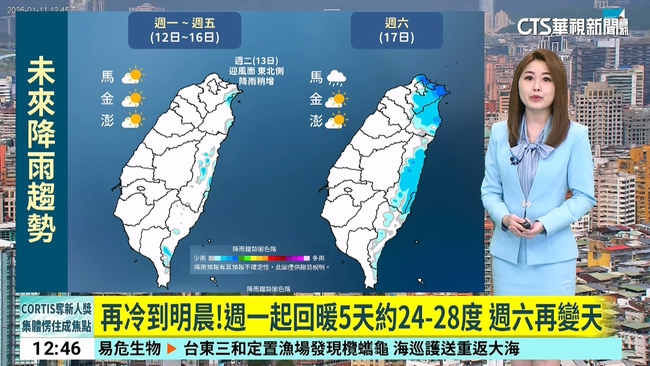 降雨方面,雖然整體環境偏乾,明後2天,中部以北山區,會有零星降雨。另外是到週六,還會有東北季風影響,迎風面北東地區可能會有降雨。