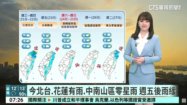 今(21)日強烈大陸冷氣團影響,中部以北、宜蘭及花蓮天氣寒冷,其他地區早晚亦寒冷,白天也偏涼;西半部及宜蘭低溫只有11至13度,花東為15至16度,尤其今天的清晨及夜晚臺南以北、宜蘭、花蓮及金、馬局部地區有10度左右或以下氣溫發生的機率,農漁養殖業請慎防寒害,使用瓦斯熱水器具應注意通風,避免一氧化碳中毒;預測白天北部及宜蘭高溫僅13、14度,花東約18、19度,中南部高溫約20、21度;天氣方面,由於環境水氣偏多,基隆北海岸及大臺北山區有局部大雨發生的機率,桃園以北及宜蘭地區有短暫雨,花蓮地區有局部短暫雨,竹苗、臺東地區、恆春半島及中南部山區有零星短暫雨,其他地區雲量亦偏多;若低溫與水氣配合,3000公尺以上及北部、宜蘭2000公尺以上的高山有零星降雪機率。