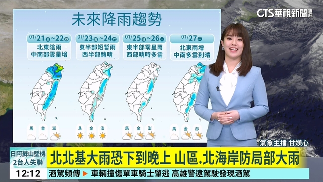 今天(21)日強烈大陸冷氣團影響,中部以北、宜蘭及花蓮天氣寒冷,其他地區早晚亦寒冷,白天也偏涼;西半部及宜蘭低溫只有11至13度,花東為15至16度,夜晚清晨臺南以北、宜蘭及金、馬局部地區有10度左右或以下氣溫發生的機率,農漁養殖業請慎防寒害,使用瓦斯熱水器具應注意通風,避免一氧化碳中毒;預測白天北部及宜蘭高溫僅13、14度,花東約18、19度,中南部高溫約20、21度;天氣方面,由於環境水氣偏多,基隆北海岸及大臺北山區有局部大雨發生的機率,桃園以北及宜蘭地區有短暫雨,花蓮地區有局部短暫雨,竹苗、臺東地區、恆春半島及中南部山區有零星短暫雨,其他地區雲量亦偏多;若低溫與水氣配合,3000公尺以上及北部、宜蘭2000公尺以上的高山有零星降雪機率。