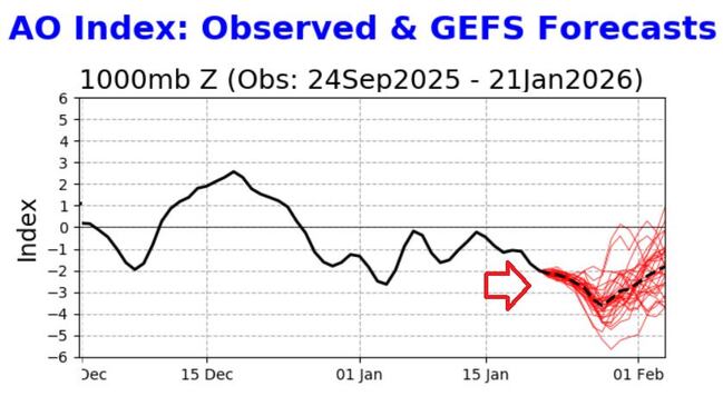 鄭明典表示,通常北極振盪指數在-2~2之間,會視為不顯著,當成雜訊。但是持續小於-2,那天氣變化上就容易出現「負北極振盪」的特徵,就是暖空氣容易入侵北極圈,然後北極圈的冷空氣容易外流到中緯度地區,帶來中緯度局部嚴寒的天氣。