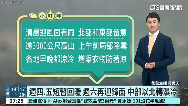今(28)日受東北季風伴隨華南雲雨區東移影響,各地早晚涼冷,中部以北及宜蘭清晨低溫普遍在13至15度,南部及花東16至18度,預測白天北部及宜蘭高溫僅16至18度,整天涼冷,至於中南部地區高溫約23至26度,花東地區則為20至23度,應適時增添衣物以免著涼;降雨方面,清晨受華南雲雨區東移影響,迎風面北部及東半部地區有局部短暫雨,中南部地區亦有零星小雨,大臺北山區及基隆北海岸雨勢較大,白天起華南雲雨區遠離,新竹以南地區轉為多雲到晴的天氣,迎風面降雨也逐漸趨緩,今日上午之前3000公尺以上高山,有局部降雪現象,白天起水氣減少,降雪機率將明顯降低,但高山夜間及清晨氣溫偏低,路面易結冰,山區行車應注意路況安全。