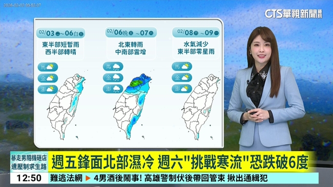 今(3)日清晨大陸冷氣團影響,各地天氣偏冷,中部以北及宜蘭低溫約13、14度,南部及花東低溫約15至17度,白天起大陸冷氣團減弱,氣溫漸回升,北部及宜花高溫約17至21度,中部及臺東高溫約22至24度,南部高溫可達26度;至於降雨方面,今日風向由東北風轉偏東風,迎風面東北部及東部地區有局部短暫雨,基隆北海岸、東南部地區、恆春半島有零星短暫雨,其他地區為多雲到晴的天氣。