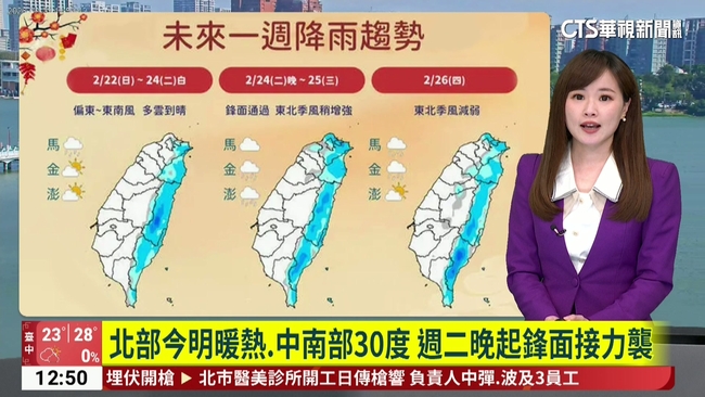 9天年假今天是最後一天,明(23)日就要開工了!今(22)日全台天氣多雲到晴,白天各地高溫十分炎熱,中部以北、宜蘭地區,高溫來到25到29度,南部高溫有機會來到30度,外島澎湖23到26度,金門及馬祖地區、高溫也分別在22到24、以及17到19度之間,但早晚還是偏涼。明天開工日,天氣和今天類似,不過週二下半天開始,就要變天轉涼了。週三開始有數波鋒面、東北季風接力來襲,而且鋒面有一波比一波強的趨勢,降雨範圍會越來越廣,北部及東半部地區將轉為局部短暫雨的天氣,天氣也會逐漸轉涼。不過春季天氣變化快速,提醒您,持續關注最新的天氣動態。