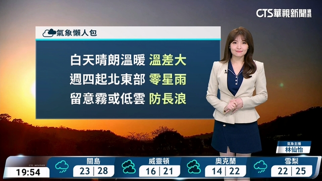 明(18)日各地大多為晴到多雲,環境風場為東南風,迎風面的花蓮、臺東及恆春半島有零星短暫陣雨,午後大臺北及東北部山區亦有零星短暫陣雨;白天各地舒適溫暖,高溫普遍在25至29度,中南部近山區可以來到30度,早晚各地仍較涼,中部以北及東北部低溫約14至17度,南部及花東為18、19度,日夜溫差大,早出晚歸請多添加衣物。