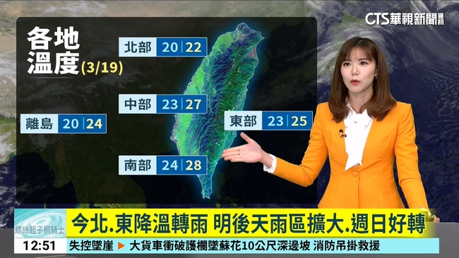 今(19)日鋒面通過及東北季風增強,北部及東北部氣溫稍下降,其他地區早晚偏涼,台灣東半部、新竹以北地區、恆春半島有局部短暫陣雨,午後苗栗以南山區有零星短暫陣雨,其他地區及澎湖、金門、馬祖為多雲到晴。明(20)日東北季風影響,北部及東北部天氣稍涼,其他地區早晚亦涼;鋒面位於台灣東北部海面,桃園以北、東半部地區、竹苗山區及恆春半島及馬祖有局部短暫陣雨,晚起東北部及東部山區有局部大雨發生的機率。