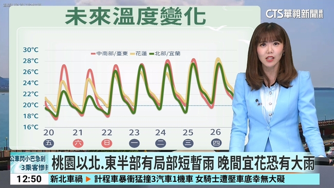 北部、東北部及東部白天高溫約22至24度,中南部地區及臺東,高溫約28至30度,各地低溫約16至19度,中南部日夜溫差較大,南來北往也請留意南暖北涼的氣溫變化。離島天氣,澎湖多雲時晴,19至22度;金門晴時多雲,15至21度;馬祖陰天,12至15度。