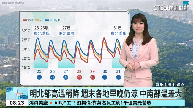 離島天氣:澎湖晴時多雲,21至25度;金門晴時多雲,17至22度;馬祖陰短暫陣雨或雷雨,14至16度。