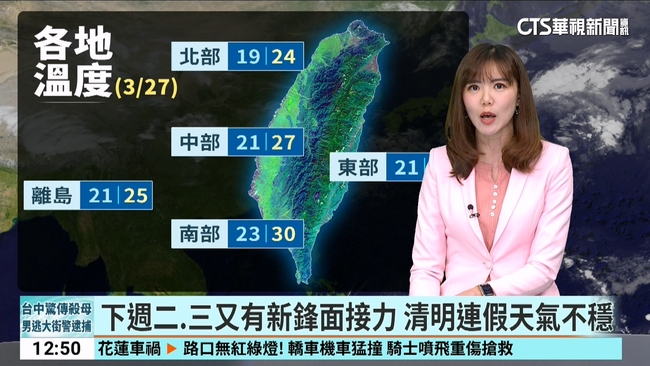 今天(27日)鋒面通過及東北季風稍增強,北部降雨較明顯,局部有短暫陣雨,尤其上午有較大雨勢出現,外出請記得攜帶雨具並注意安全,而中部、東半部地區及恆春半島雲量偏多,偶爾亦有零星降雨,對於南部地區天氣影響最小,大多仍可見陽光,為晴到多雲,僅午後在山區有零星短暫陣雨;氣溫方面,北臺灣天氣稍轉涼,白天高溫為22至24度,中部及花東為25至28度,南部仍可達29至32度,感受上溫暖微熱,低溫方面變化不大,早晚在北部及宜蘭低溫為18至20度,中南部及花東為20至22度。