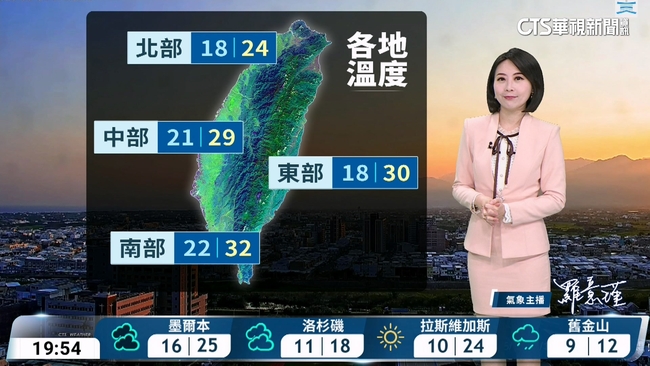 明(1)日上半天受鋒面影響,清晨起雨帶由北往南移動,各地降雨機率增,西半部地區易有短暫陣雨或雷雨,尤其中部以北地區在清晨至上午有較大雨勢出現的機率,伴隨雷擊及強陣風,行車交通請特別注意安全,不過下半天之後各地降雨逐漸趨緩,剩花東地區有局部短暫陣雨;溫度方面,鋒面通過後東北季風南下,北臺灣天氣轉涼,其他地區氣溫亦略降一些,北部及宜蘭高溫僅有20至23度,中部及花東為27至29度,而南部仍可來到30至33度,低溫在北部及宜花下降到17至19度,其他地區則為20至22度,請注意天氣的變化適時調整衣物。