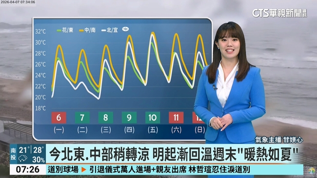 今(7)日鋒面影響,各地天氣不穩定,中部以北地區都有雷陣雨,其中北部地區有局部大雨發生的機率,中部地區亦有局部較大雨勢發生的機率,請留意雷擊、強陣風及短延時強降雨的天氣現象,其他地區或多或少也有局部短暫陣雨或雷雨,外出應攜帶雨具備用;氣溫方面,鋒面通過後,東北季風增強,北臺灣天氣稍轉涼,新竹以北及宜蘭高溫約22至24度,苗栗以南至中部及花東高溫約26至29度,南部高溫可達31度左右,至於低溫約20至23度。
