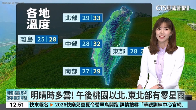 離島天氣:澎湖晴到多雲,25至28度;金門晴時多雲,21至26度;馬祖多雲短暫陣雨或雷雨,19至23度。