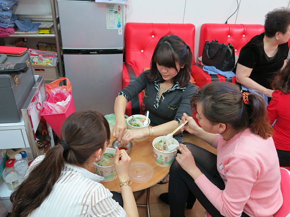 店內的員工利用工作空檔,坐在一起吃飯、聯絡感情。 攝影/陳薏筑