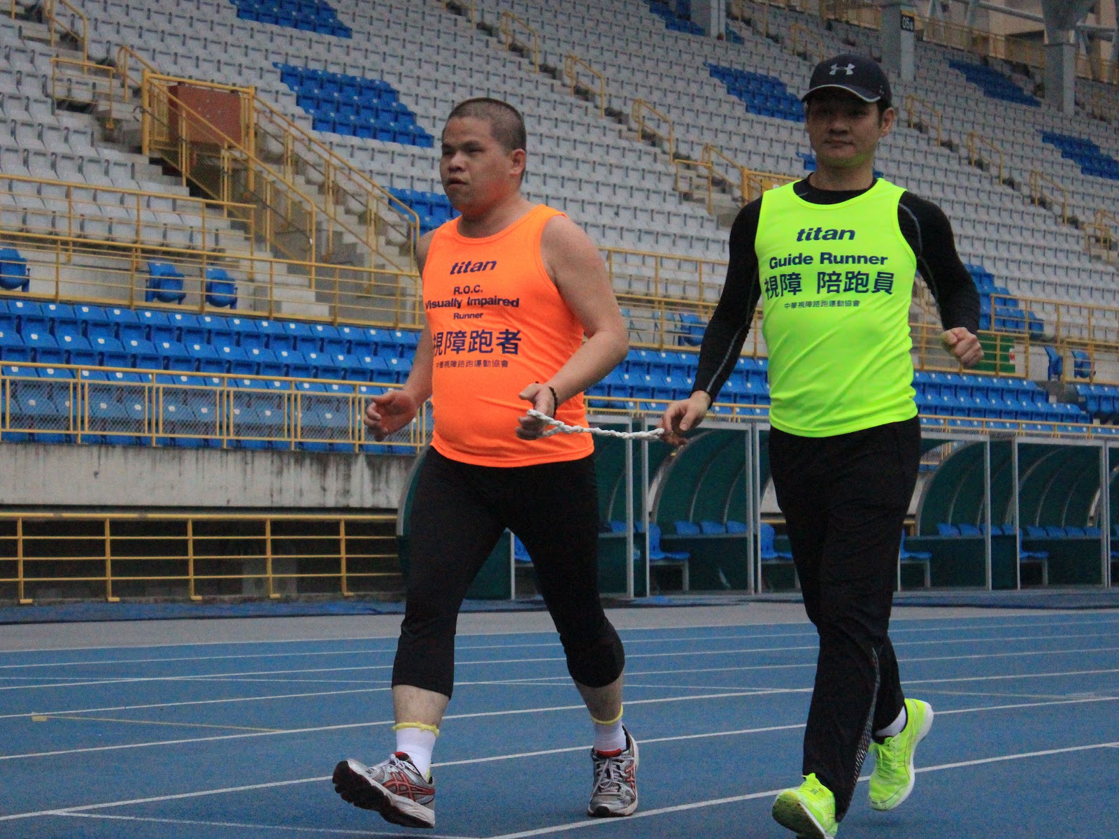 陪跑員用陪跑繩帶領視障者跑步 攝影/吳盈萱 |