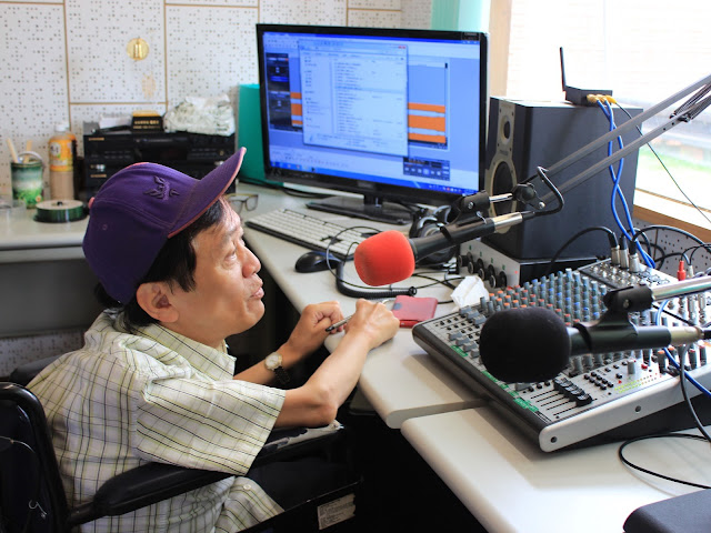 | 劉銘在淡水的無障礙錄音間錄製節目「大小一家親」。 攝影/吳盈萱 |
