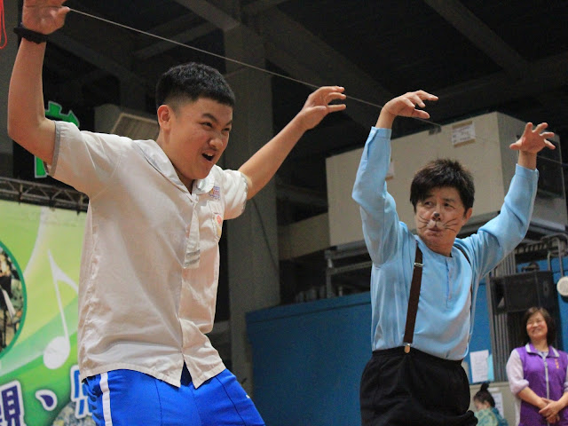 | 表演默劇的陳濂僑(圖右)與榮富國小的學生互動表演。 攝影/劉兆為 |